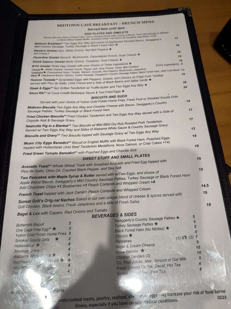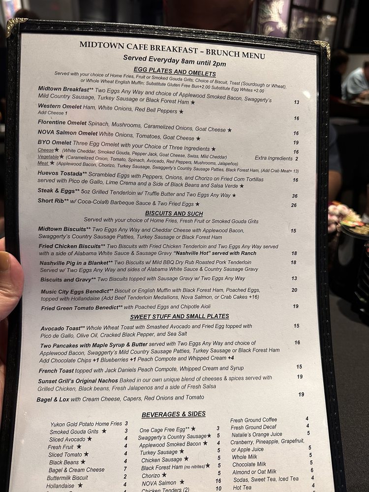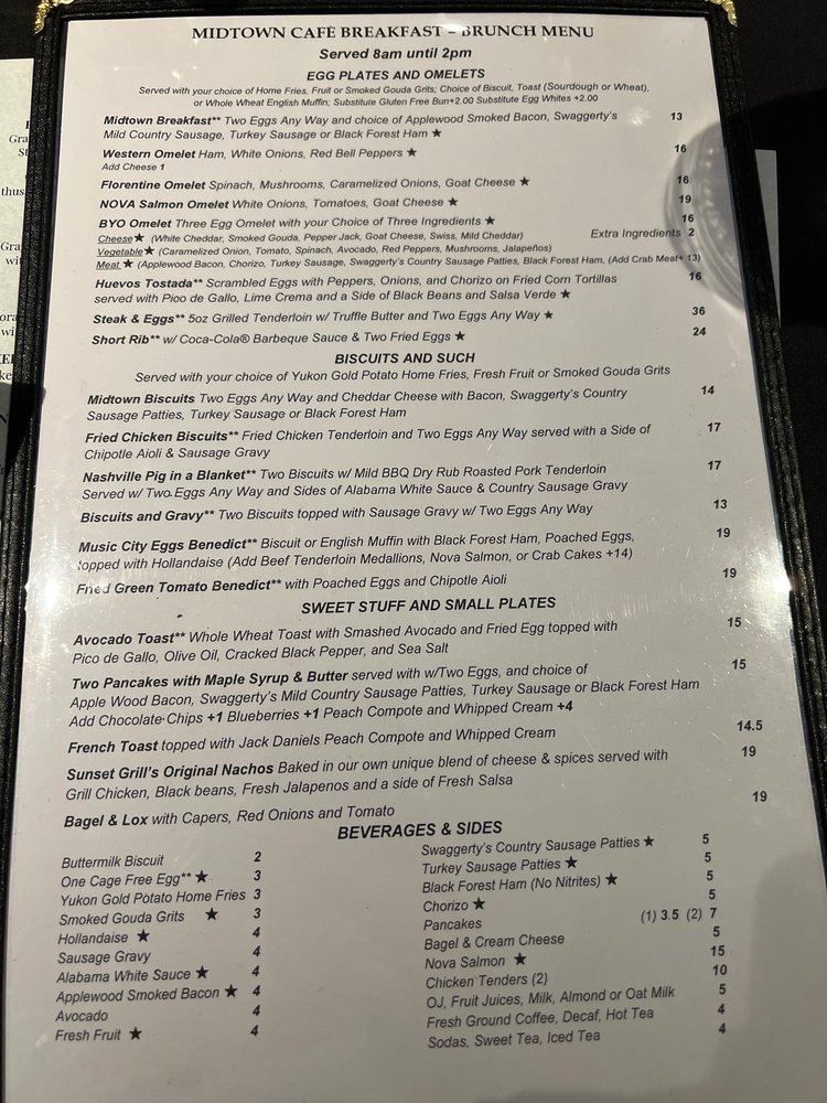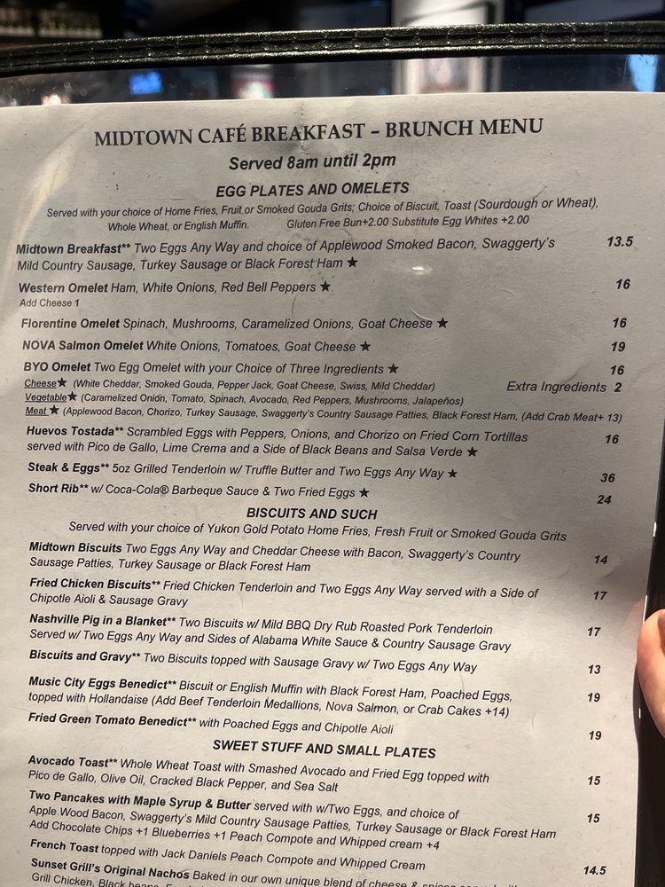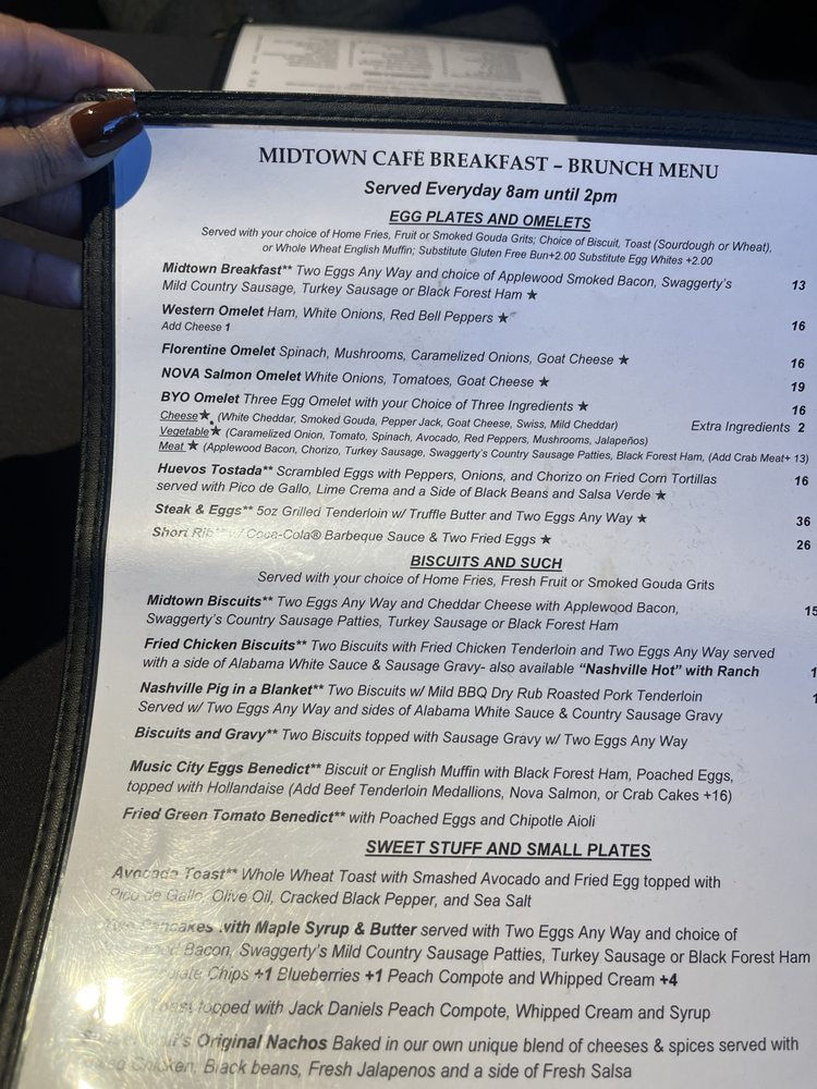 Midtown Cafe, a Southern Breakfast & Brunch American restaurant in Nashville, TN, offers a diverse menu with Southern classics and unique twists. From their Egg Plates & Omelets featuring options like Nova Salmon Omelet and Steak and Eggs to their Biscuits & Such with Fried Chicken Biscuits and Music City Eggs Benedict, there is something for everyone. The Sweet Stuff & Small Plates section includes delicious dishes like Avocado Toast, French Toast with Jack Daniels Peach Compote, and Shrimp & Grits. The restaurant also provides vegan and vegetarian options, making it inclusive for all diners. With various utilities like takeout, delivery, and drive-thru, Midtown Cafe ensures convenience for its customers. The welcoming ambiance, excellent service, and mouth-watering dishes make it a must-visit spot for breakfast or brunch in Nashville.